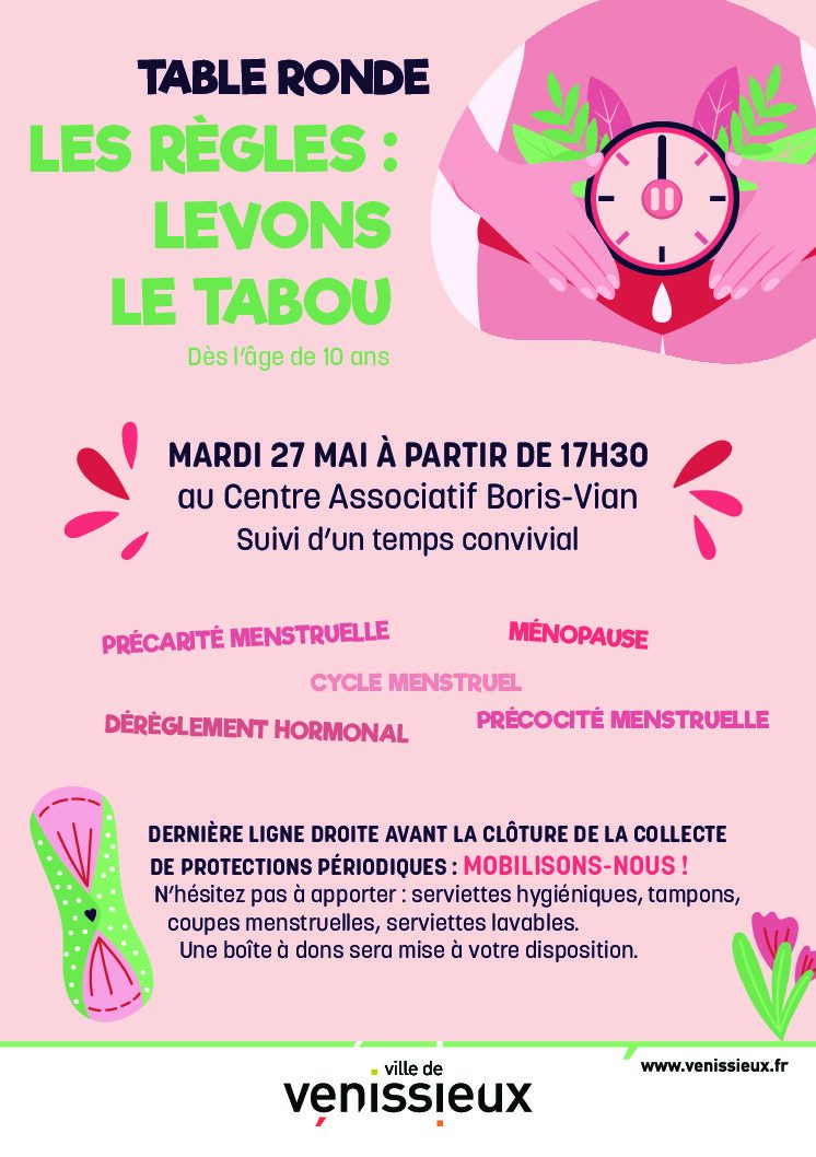 Plusieurs thématiques seront abordées au cours de cette soirée, organisée par la Ville de Vénissieux : précarité menstruelle, cycle menstruel, précocité des règles, ménopause, troubles du cycle et syndrome des ovaires polykystiques, gestion des douleurs par la médecine douce.