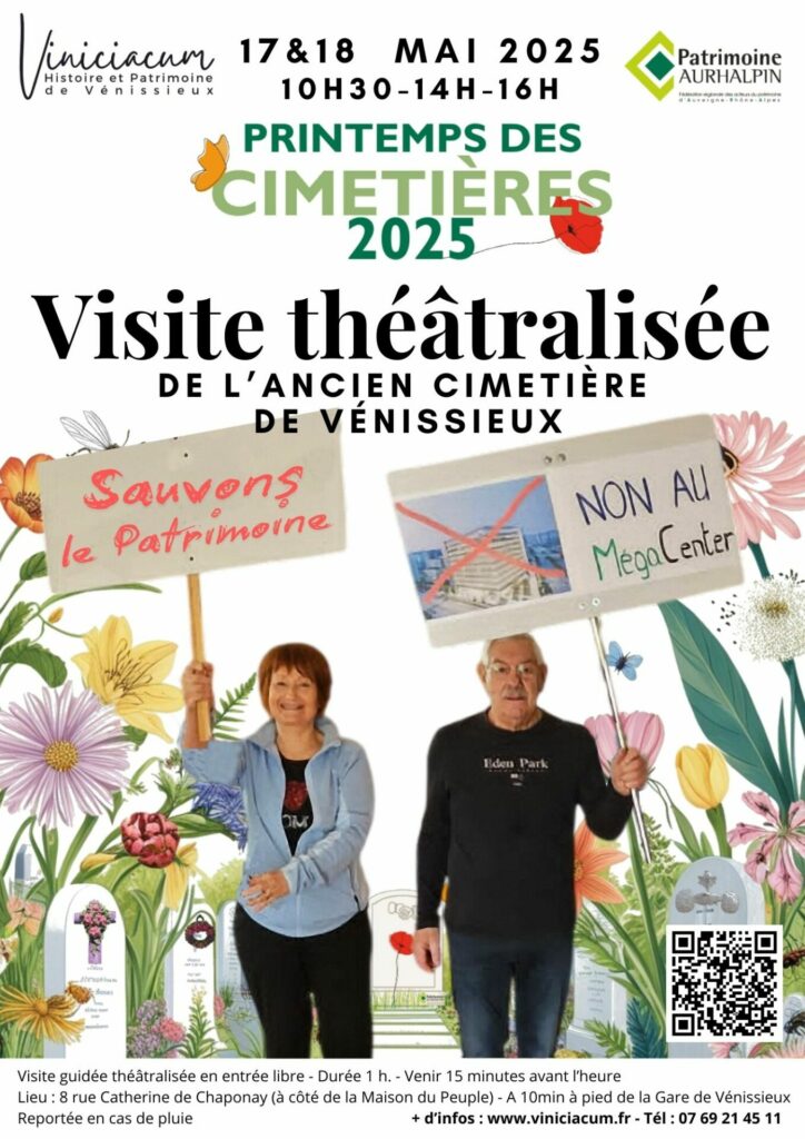 Depuis plus de 25 ans, Viniciacum, association d'histoire et de défense du patrimoine de Vénissieux, s’attache à faire découvrir l’ancien cimetière de Vénissieux à travers des visites commentées. Pour la 1ère fois, l'association organise une visite guidée théâtralisée. Cette visite originale mettra en lumière plusieurs figures marquantes de l’histoire locale, telles que le rosiériste Joseph Pernet-Ducher, l’artiste Georges Manillier, ou encore Catherine de Chaponay.
