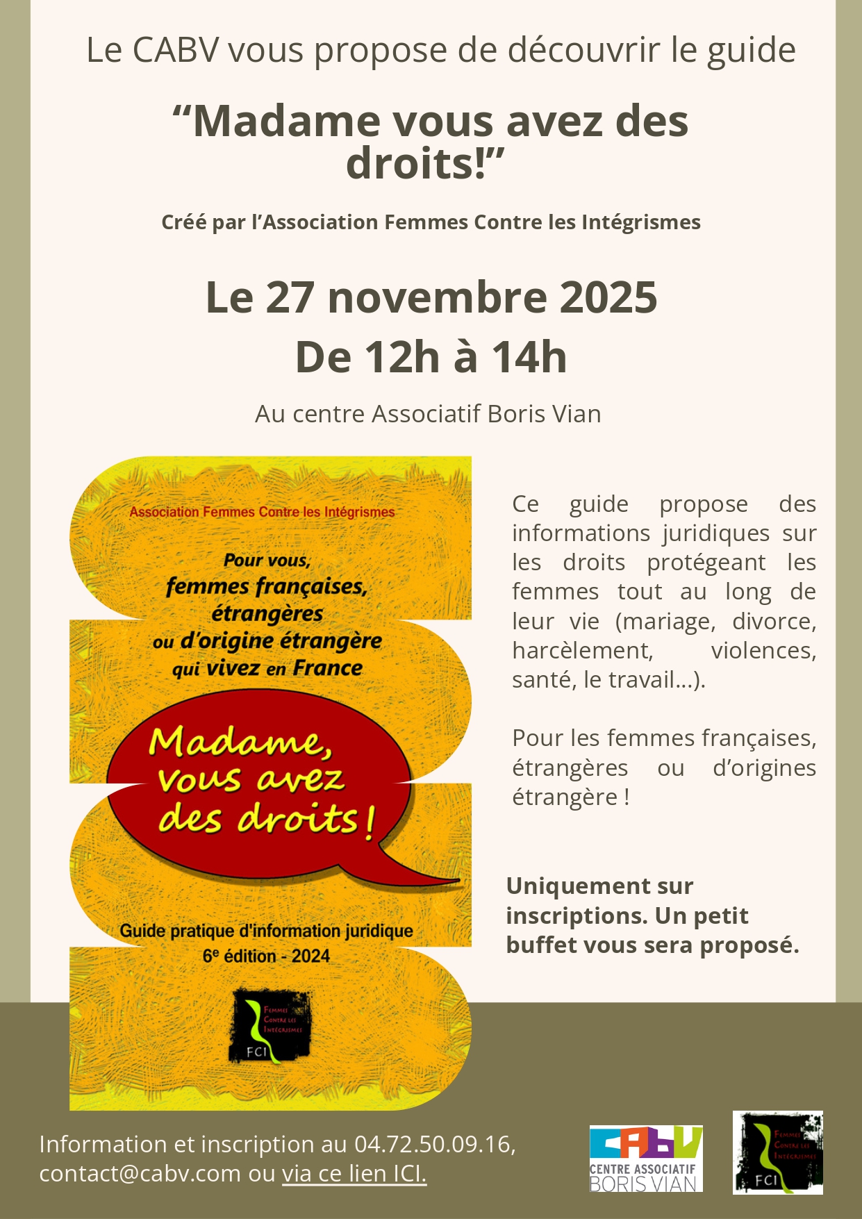 Le CABV accueille la présentation du guide « Madame vous avez des droits » de l'association Femmes Contre les Intégrismes (FCI). Ce guide propose des informations juridiques sur les droits protégeant les femmes tout au long de leur vie (mariage, divorce, harcèlement, violences, santé, le travail...)