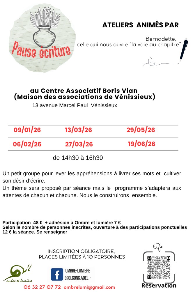 L'association Ombre et Lumière vous propose de faire "une pause écriture" 1 fois par mois à partir de janvier 2026.